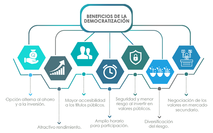 El proceso de Democratización contribuye a generar una mayor aceptación de los valores gubernamentales entre el público en general y ha sido de utilidad en otros mercados para transmitir conocimiento y fortalecer la cultura del ahorro y la inclusión financiera entre la población en general. Adicionalmente, se planea poner en marcha importantes innovaciones y funcionalidades tecnológicas que facilitarán el acceso y la operación de sus plataformas, para permitir al público invertir directamente en títulos de deuda gubernamental, incluyendo a través de dispositivos móviles.